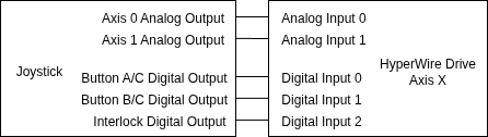 - The joystick axis analog outputs are connected to Analog Input 0 and Analog Input 1 on the HyperWire drive that corresponds to axis X.