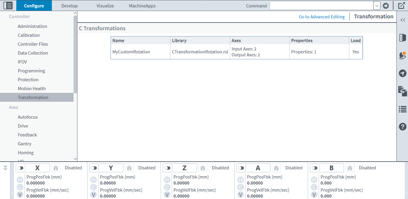 Advanced Editing in the Transformation module lets you specify the behavior of transformations and the position signals of the axes used in them. You can also specify the order in which the controller executes IFOV and C transformations.