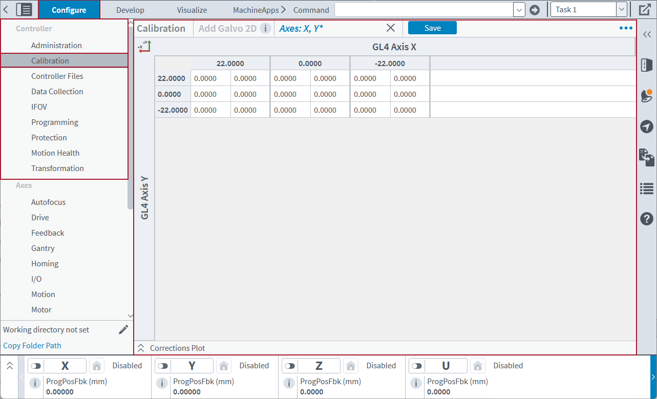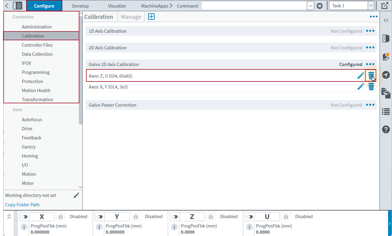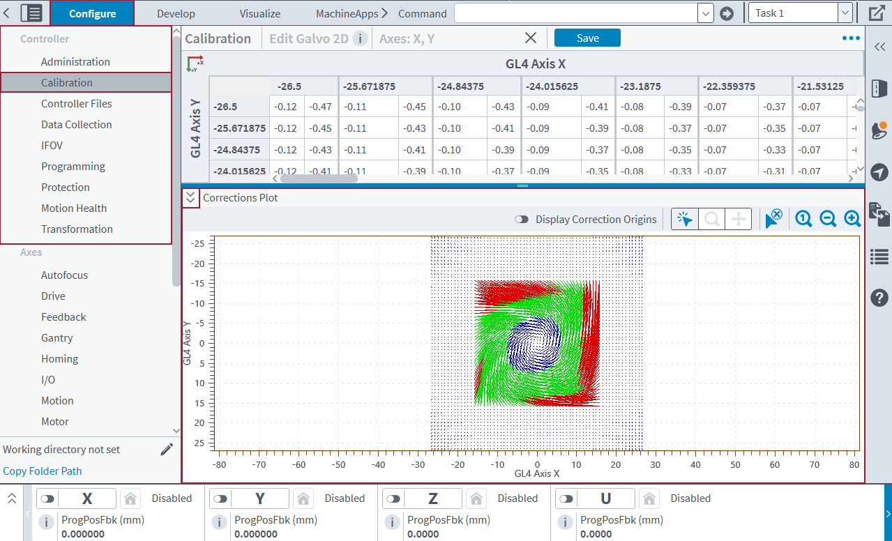 As an alternative to the Configure workspace, you can use the CalibrationLoad() function to load and activate axis calibration and Galvo Power Correction files without resetting the controller. For more information, see Calibration Functions.