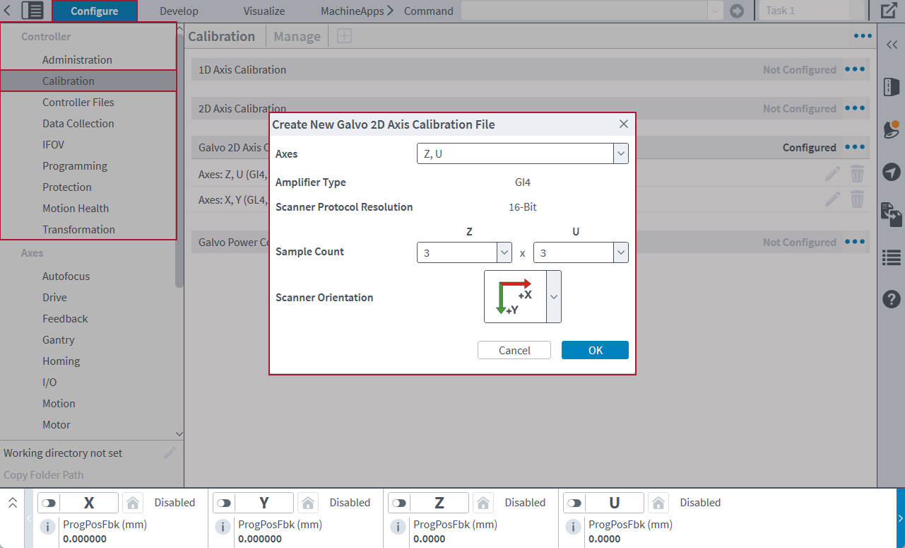 Use the Calibration module to create, open, edit, and merge Galvo 2D Axis calibration files that you can use with an Aerotech controller. Before you can make a new calibration table, you must first configure the galvo scanner axes. Do the Machine Setup process to configure these axes. See Machine Setup for more information. Each calibration table is then applied to its related galvo scanner axes.
