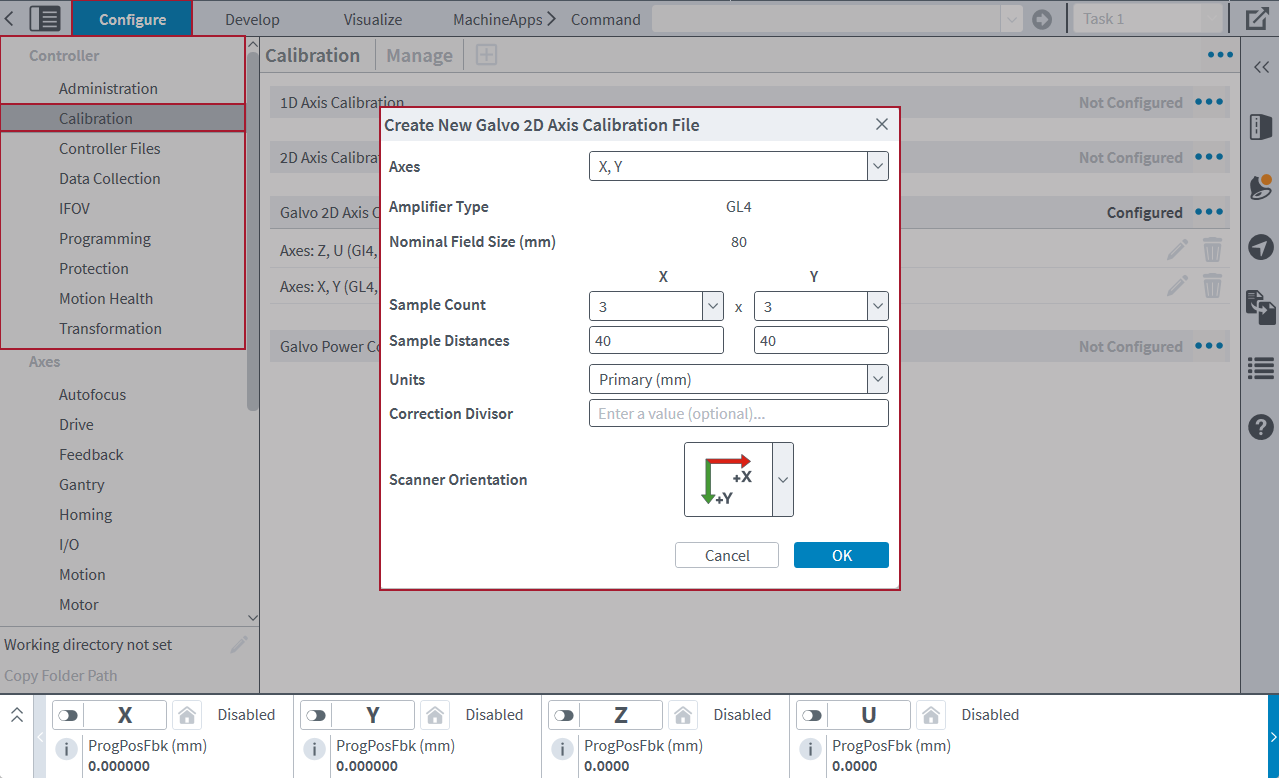 Use the Calibration module to configure axis calibration files (1D, 2D, and Galvo 2D) and Galvo Power Correction files. You can see the status of each file and modify the configured calibration files on the controller.