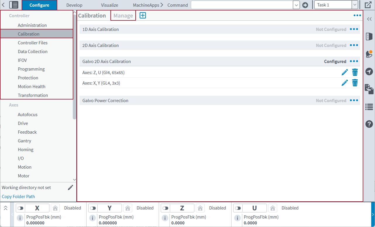 - In the Configure workspace, find the Controller category. Then select the Calibration topic. Make sure that the Manage screen is in view.
