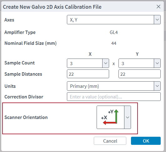 When you make an empty Galvo 2D Axis Calibration table, the Create New Galvo 2D Axis Calibration File dialog shows a Scanner Orientation feature. The orientation you select will determine how the application shows the table in the Calibration module, based on the positive direction of each axis. The scanner orientation does not have an effect on the contents of the table. It only changes the view of the table. Make sure you select the scanner orientation that corresponds to the physical configuration of your galvo scanner.
