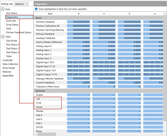 If the EOT limits are reversed, you will be able to move further into a limit but be unable to move out. To correct this, swap the connections to the CW and CCW inputs at the Feedback connector or swap the CW and CCW limit functionality in the software using the EndOfTravelLimitSetup parameter. View the logic level of the EOT limit inputs in the Diagnostics display (shown in End of Travel and Home Limit Input Diagnostic Display).