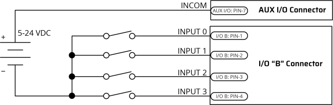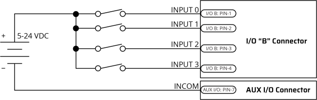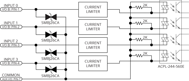 Input bits are arranged in a group of 4 and share a common pin (INCOM, PIN-7, located on the Auxiliary I/O connector). This lets a group be connected to current sourcing or current sinking devices, based on the connection of the common pin.