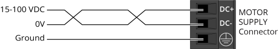 Motor power is applied to the DC+ and DC- terminals of the Motor Supply connector.