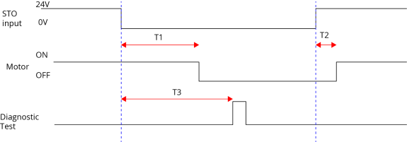 | T2 | STO deactivated to motor power on (the software is typically configured so that the motor does not automatically re-energize). | < 1 msec |