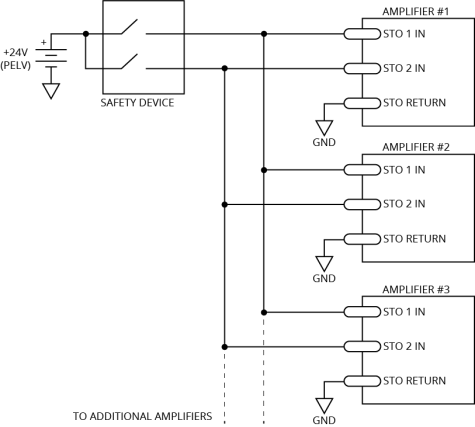 The motor can only be activated when voltage is applied to both STO 1 and STO 2 inputs. The STO state will be entered if power is removed from either the STO 1 or the STO 2 inputs. When the STO state is entered, the motor cannot generate torque or force and is therefore considered safe. Both STO channels must be driven at the same time. If they are not driven at the same time, a diagnostic test failure will occur (refer to STO Diagnostics).