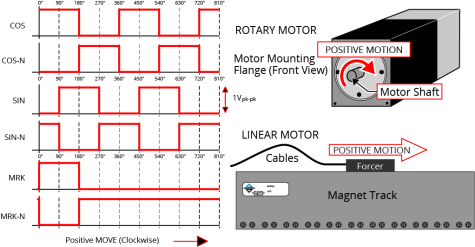 Incorrect encoder polarity will cause the system to fault when enabled or when a move command is issued. Encoder Phasing Reference Diagram (Standard) illustrates the proper encoder phasing for clockwise motor rotation (or positive forcer movement for linear motors). To verify, move the motor by hand in the CW (positive) direction while observing the position of the encoder in the diagnostics display (see Position Feedback in the Diagnostic Display).