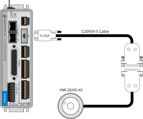 Connect a handwheel to the Aux connector as shown in Handwheel Interconnection to the Aux Connector.