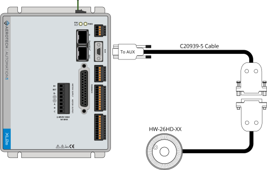 Connect a handwheel to the Aux connector as shown in Handwheel Interconnection to the Aux Connector.
